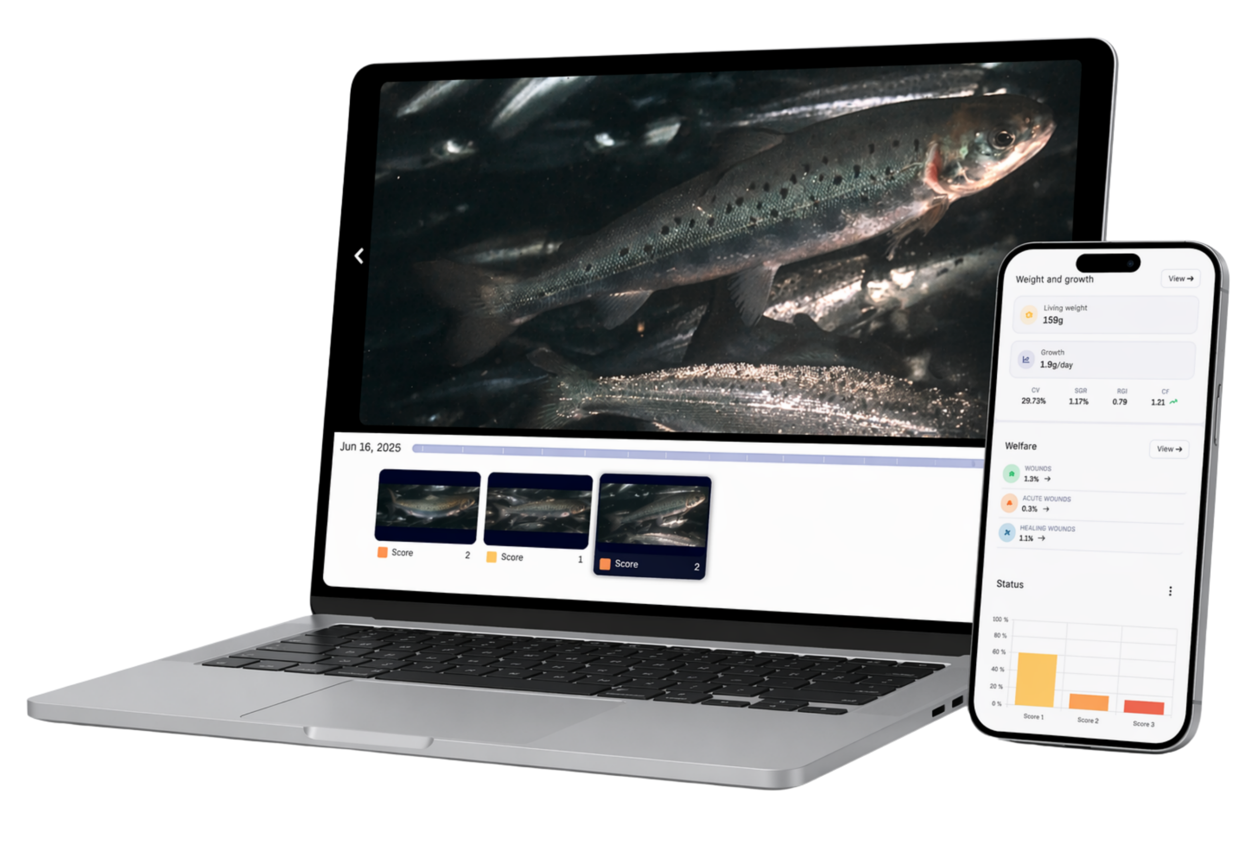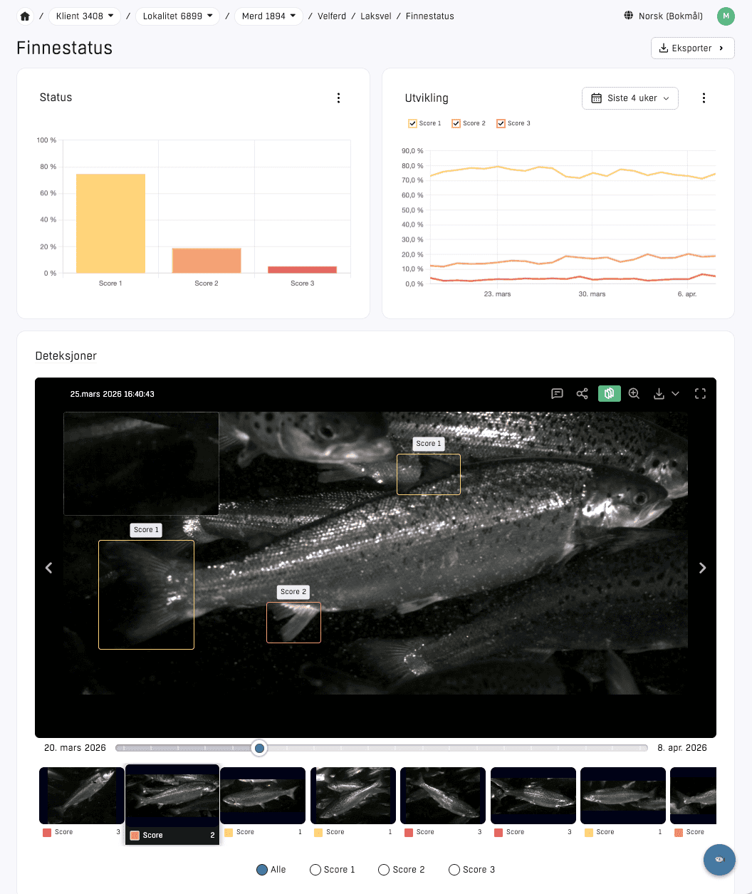 The system analyzes high-resolution images in real time and recognizes deviations with high accuracy. You receive ongoing welfare information directly into the web portal – ready for use in assessments and follow-up. You avoid handling and manual counting – and instead get a reliable basis for decision-making that makes it easier to monitor welfare in production.